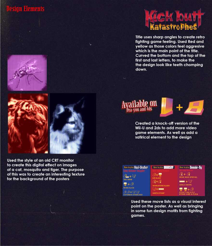 KickButt Katastrophes is a continuation on my bestiary project from Visual Methods freshman year. In designing KickButt Katastrophes I wanted to play of the aesthetic style of late 90’s to early 2000’s fighting games, this style also influenced the logo of the project.